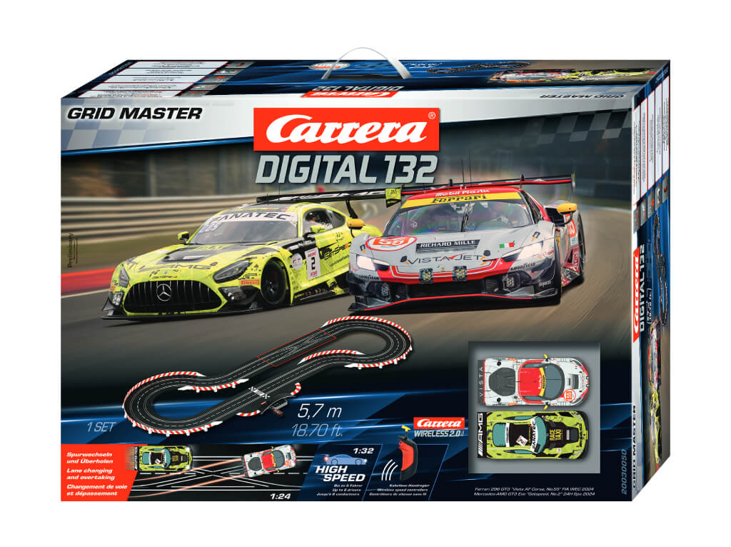 Dva absolutní králové světového GT závodění se střetávají na vaší dráze! Autodráha Carrera Digital 132 30050 Grid Masters přináší na trať o délce 5,7 metru přímé souboje dvou nejprestižnějších závodních značek světa – Ferrari a Mercedes-AMG – ve věrných replikách jejich skutečných závodních speciálů z roku 2024.